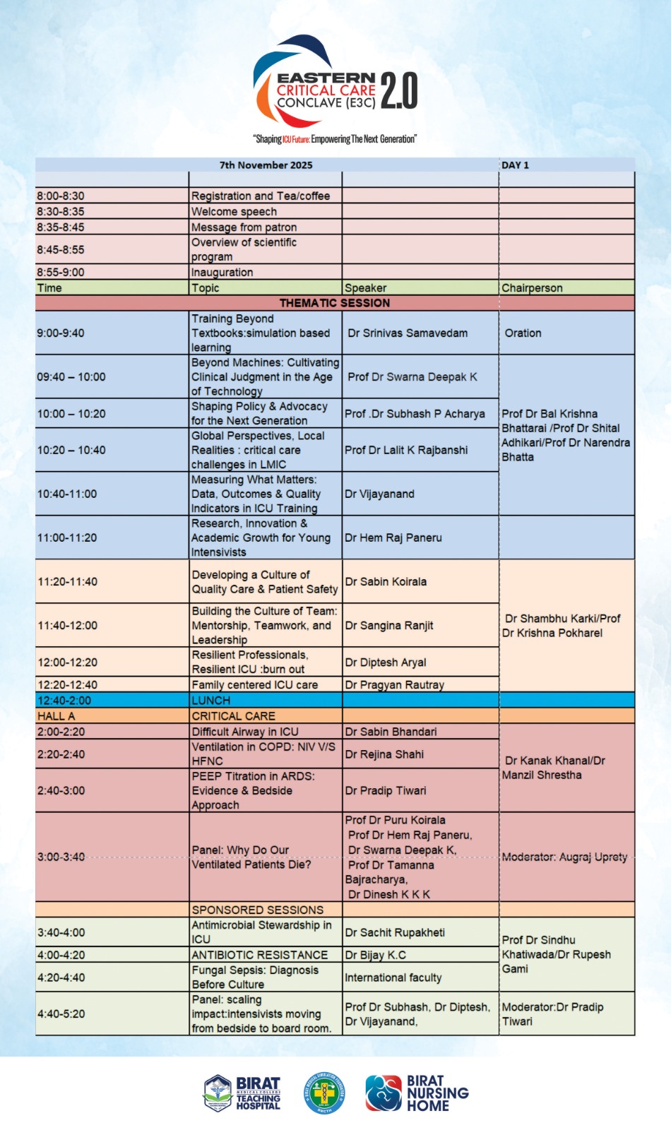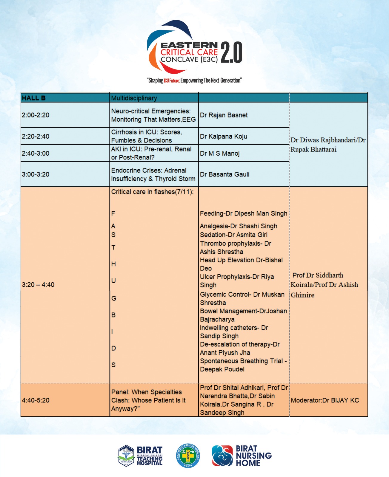 The Scientific Program of the 2nd Eastern Critical Care Conclave 2025, led by Scientific Chairperson Dr. Batsalya Arjyal, is designed to foster evidence-based discussions, hands-on learning, and collaboration among critical care professionals. Scheduled for 7–8 November 2025 at Birat Medical College Teaching Hospital, Biratnagar, the program embraces the theme “Shaping ICU Future: Empowering the Next Generation.”